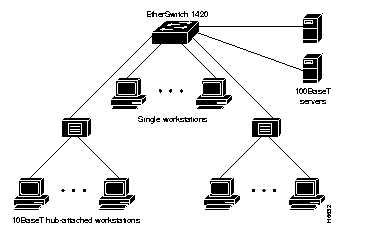 The EtherSwitch 1420 or 1220 supports 25 switched Ethernet connections for single workstations or 10BaseT hubs. Two 100BaseTX modules (EtherSwitch 1420) or two fixed 100BaseTX ports (EtherSwitch 1220) are used to connect to servers, as shown in Figure 2-1.