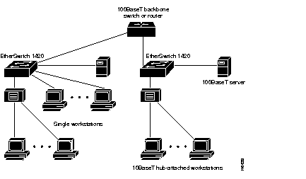 EtherSwitch 1420s and 1220s can connect to a 100BaseT backbone switch or router, as shown in Figure 2-4. With support for full-duplex operation, each 100BaseT link supports up to 200 Mbps of bandwidth and fiber-optic cabling distances of up to 2 kilometers.