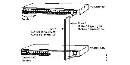 Figure 2-3 illustrates two trunks that are connected to the switched 100BaseTX ports on two Catalyst 1900 switches. The port cost of carrying VLAN traffic across these trunks is equal.