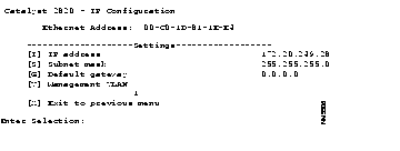 | Assign IP address to Catalyst 2820 or 1900 | 0.0.0.0 | IP Configuration |