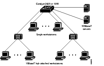 The Catalyst 2820 or 1900 supports 24 switched 10BaseT connections for single workstations or 10BaseT hubs. With the Catalyst 2820, you can use two 100BaseTX modules to connect to servers, as shown in Figure 2-1. With the Catalyst 1900, you can use the fixed 100BaseTX ports or the 100BaseFX port to connect to servers.