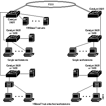 Figure 2-5 shows Catalyst 2820s and connecting to a 100BaseT backbone switch or router in a redundant backbone configuration, using the Spanning-Tree Protocol. With support for full-duplex operation, each 100BaseT link supports up to 200 Mbps of bandwidth and fiber-optic cabling distances of up to 2 kilometers.