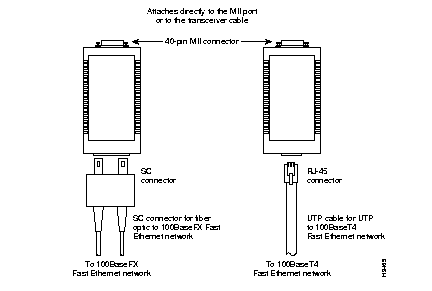 Ethernet transceivers are available from a variety of sources for Virtual Terminal Protocol (VTP) and multimode fiber-optic cabling (100BaseFX at 100 Mbps). Figure 3-2 shows an example of Fast Ethernet transceivers and connection equipment.