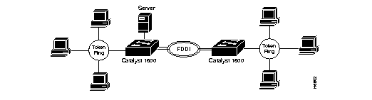If you use the module to connect the Catalyst 1600 to another Catalyst 1600 over a FDDI backbone, and you do not connect the Catalyst 1600 to other devices on FDDI networks, make sure protocol fixups are disabled. In Figure 5, protocol fixups are disabled and the FDDI interface functions in the same way as a source-routing Token Ring port. This enables the workstations and servers connected to the Catalyst 1600 to communicate with Token Ring stations connected to the second Catalyst 1600.