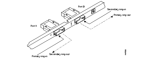The FDDI module has dual fiber MIC connectors that connect the Catalyst 1600 to the media. The MIC receptacles are called Port A and Port B. Port A provides the primary ring-in and secondary ring-out, while Port B provides the secondary ring-in and primary ring-out.
