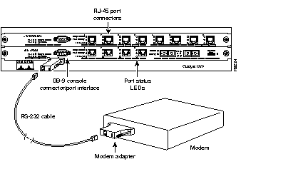 Step 3 Plug the RJ-45 connector at the other end of the EIA/TIA-232 cable into the RJ-45-to-DB-25 male adapter labelled "Modem."