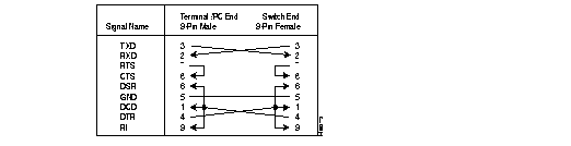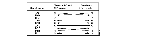 Use a null-modem (crossover) cable (Figure F-5) to connect the EIA 232 port to a terminal (DTE) with a 9-pin connector. Alternatively, you can use a modem cable and a null-modem adapter. DTR (pin 4) and RTS (pin 7) must be on, or high, on your terminal or in your terminal emulation program.