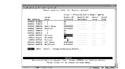 To view the entries in the address table for each domain, select Domain Address Table on the Status/Statistics Menu. The Domain Address Table panel (Figure 7-6) is displayed. The entries are listed in the order in which they were encountered.