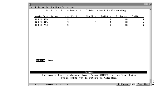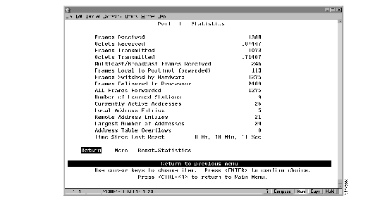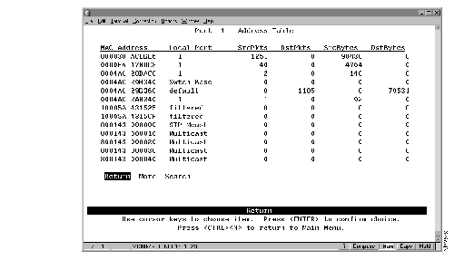 To view the entries in the address table of a specific port, select Port N Address Table on the Status/Statistics Menu and specify a port number. The Port N Address Table panel (Figure 7-7) is displayed. The port address table can contain up to 1790 entries. The entries are listed in the order in which they were encountered.