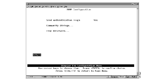 To view or change the community names for the domains of the Catalyst 2600, select Community Strings on the SNMP Configuration panel. The Community Strings panel (Figure 7-18) is displayed. A community name is a name associated with the Catalyst 2600 and a set of SNMP managers that are allowed to manage it with the specified privilege level.