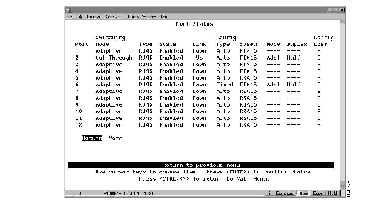 - Type--The port type. Ports 1 through 16 are RJ45. If a UFC is installed, each of its ports and port types will be listed here.