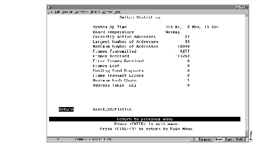 To view operating statistics for the Catalyst 2600, select Switch Statistics on the Status/Statistics Menu. The Switch Statistics panel (Figure 7-8) is displayed. This panel is automatically refreshed every 10 seconds.