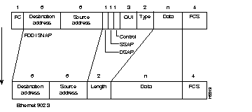 An Ethernet 802.3 frame is translated into an FDDI SNAP frame as shown in Figure C-5. When an Ethernet 802.3 frame is received, the FC field is added to the FDDI frame, and the Length field is stripped. Any padding in the Ethernet data field is dropped.