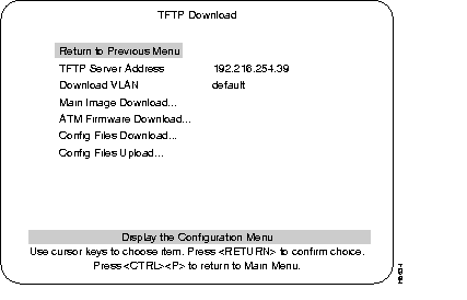 The TFTP Download menu is accessed through the Main Menu. From the Main Menu select the Download Menu and then select the TFTP Download Menu.