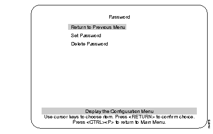 Use the Password menu to add, change, or delete a password. If you establish a password, users must enter it to access the Console menus. If there is no password, just press RETURN at the password prompt.