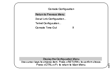 Start the console by pressing RETURN. If a Telnet session is active, press RETURN at the console to terminate the Telnet session and press RETURN again to start the console session.