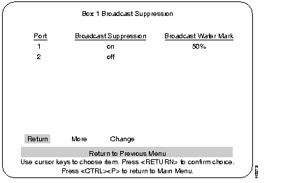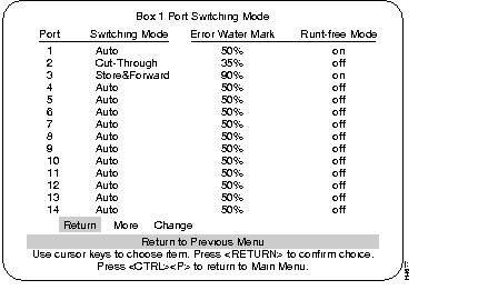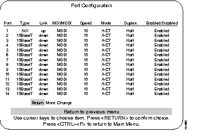 In hardware mode, the duplexing is controlled by the duplex switches on the switch unit. In software mode, the duplexing is controlled at this menu. To switch between hardware and software mode, select the Port Duplex Control heading and press RETURN. The choice of Hardware or Software will appear. Select your choice and press RETURN. Selecting software will allow you to select the duplex mode for a specific port.