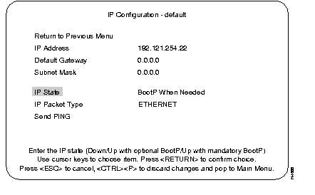 Select choices of IP Disabled, BootP When Needed or BootP Always by highlighting IP State and pressing RETURN, then highlighting one of the choices and pressing RETURN.