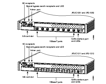 The rear panel of the switch has an AC power receptacle, an optical bypass switch receptacle and LED, an EIA-TIA-232 admin. port, a card slot for an optional CDDI or FDDI A/B port card, eight Ethernet 10BaseT (WS-C1201) or 10BaseF (WS-C1211) ports, and the SUM interface port (and LEDs). (See Figure 1-7.)