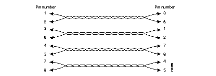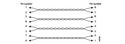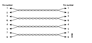 Each of the four pairs of wires that make up the twisted-pair cross-connect cable must be individually twisted. For example, the wire pair connecting pins 1 and 2 at one end of the cable must connect to pins 8 and 7 at the other end. (See Figure A-1.)