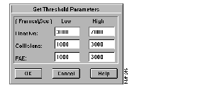 The Set Threshold Parameters dialog box, shown in Figure 2-14, defines alert thresholds at the network level for three types of events: receive events, collisions, and frequency alignment errors (FAE). You can set low and high thresholds in frames per second.