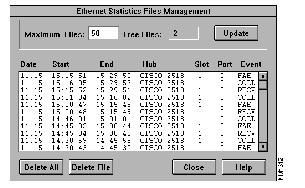 Graphical information displayed in the Ethernet Statistics window is saved in files for future retrieval. These files are in binary format and can be retrieved only by selecting a port and an event type in the Ethernet Statistics window.