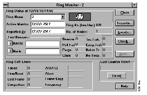The Ring Monitor window provides information about the ring, including ring status, Active Monitor, number of nodes in the ring, last beaconing state, and error counts. Information displayed is accurate as of the time shown below the title bar.