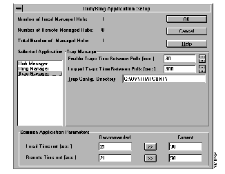 Use the Cisco Hub/Ring Manager Application Setup dialog box to change parameters that control LAN polling mechanisms and timeouts for Cisco Hub/Ring Manager applications on the network management PC. You can change these parameters according to the network load and the number of hubs being managed. Local time settings affect hubs designated as local in the Describe dialog box. Remote time settings affect hubs designated as remote in the Describe dialog box. Communications are usually more frequent with local hubs and less frequent with remote hubs in order to prevent network overload and reduce the cost of transmission.