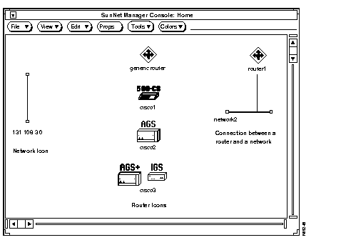 A router can have a number of interfaces. As the router is added to the view, it is also added to a network (represented by a cloud icon in SNM Console), and one for each router interface (with subnet mask applied). These networks are created in the current view as needed. If you choose to manage these subnets, you can use the SunNet Manger Discover tool to identify the devices in the subnet.