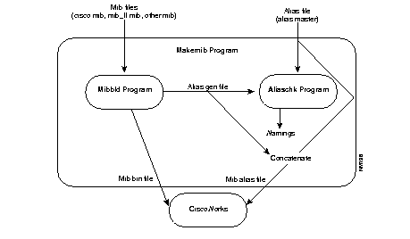 The program used to build the binary MIB file is mibbld. The program checks the contents of all the .mib files in the specified directory for syntax errors and creates a binary format mib.bin and alias.gen files usable by CiscoWorks.