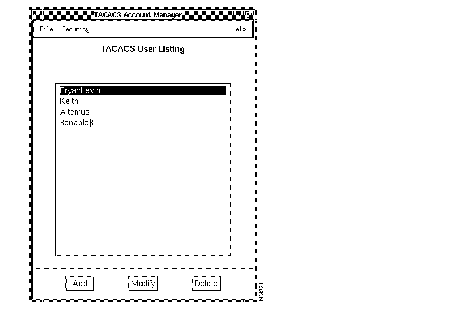 The Terminal Access Controller Access Control System (TACACS) Account Manager application maintains the TACACS password file on UNIX hosts that act as TACACS security servers. TACACS controls Internet host access from terminals using dial-up lines. The TACACS Account Manager allows you to easily create and update TACACS accounts in a graphical user interface. This application also creates computer-generated passwords. Use this application to designate which users have access to your security server.