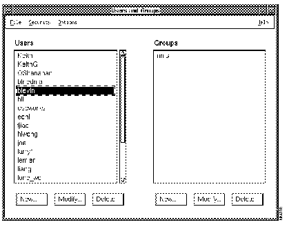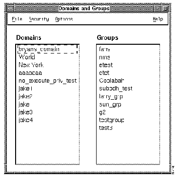| Options | Users and Groups Domains and Groups | Opens a subwindow that allows you to create, modify, and delete users and groups, and to add users to groups.