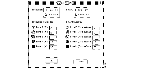 The graphical display in the Path Tool window shows the devices (including routers) involved, the link speeds connecting these SNMP devices, and the interface names. You can run several Path Tool analyses at the same time. The analyses provide color-coded severity levels for each link. Each Path Tool request appears in a separate window.