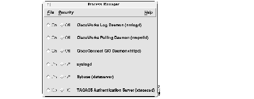 The Process Manager controls the CiscoWorks application daemon processes. A process is a UNIX-system execution of a program. A daemon is a process that runs in the background, independent of a terminal, and performs a function.You can use the Process Manager to start, stop, and show changes in status (on or off) for the CiscoWorks daemons.