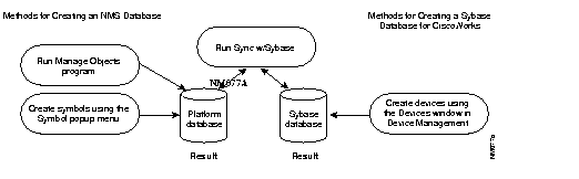 Figure 4-6 illustrates the relationship between the NetView and CiscoWorks databases. Although you can add device names directly to either database, you must run Sync w/Sybase to confirm that the information about a particular device is correct in both places.