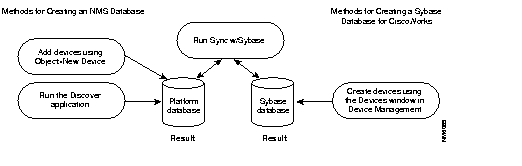 If you are adding individual devices, use the Device Management, AutoInstall Manager, or Sync w/Sybase applications to add device data to the Sybase database. For information on AutoInstall Manager, Sync w/Sybase, and Device Management, refer to the appropriate CiscoWorks online help sections.