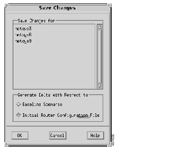 Clicking on this button displays the Save Changes window, shown in Figure 7-12. The Save Changes window contains a list combining the contents of the Modified Configuration Files and Modified This Session lists. Entries found in both lists are only listed once in the Save Changes window. You can select one, some, or all of the entries in the Save Changes For list to have delta files generated containing the changes made to either the baseline scenario or the initial revision of the router configuration file. The Save Changes window, shown in Figure 7-12 is displayed.