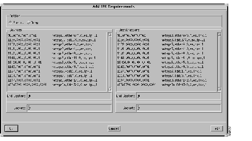 The Add IPX Requirements window, partially shown in Figure 7-5, allows new IPX connectivity requirements to be specified. The specification includes source and destination end systems to be specified, the source and destination socket to use for the requirement, and whether the requirement permits or denies connectivity.
