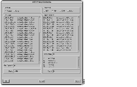Click on the IP, IPX, or SAP button to select a particular protocol type and to display the corresponding Add IP/IPX/SAP Requirements window. IP is the default Requirement Type. See "Add IP Requirements Window" for detailed information about the Add IP Requirements window components. See "Add IPX Requirements Window" for detailed information about the Add IPX Requirements window components. See "Add SAP Requirements Window" for detailed information about the Add SAP Requirements window components.