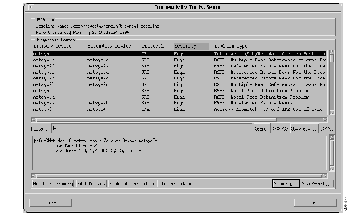 The Report Summary window, shown in Figure 5-4, is displayed. This window provides you with a summary of the types and total number of problems detected while parsing the router configuration files during the opening of the baseline. It also provides you with a statistical summary about the router configuration files and interfaces being used as well as a summary of the number of parsed and unparsed router commands and non-connectivity related router commands detected during the parsing of the router configuration files. See Chapter 5, "Diagnostic Report," in the Enterprise/Solver Connectivity Tools Reference Manual for detailed information about the Report Summary window.