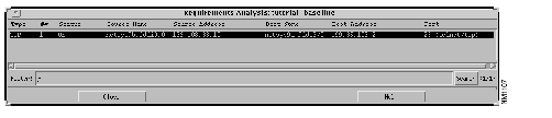 The tcp_telnet_test connectivity requirements are loaded for analysis. The results of the analysis are viewed from the Requirements Analysis window, partially shown in Figure 7-8. That is, the status of each connectivity requirement loaded for analysis, can be viewed. In this case, one path was found between the two end systems (netsys9b.fddi0.0.es and netsys9a.fddi3/0.0.es). To view the entire contents of the window, use the horizontal slider bar.