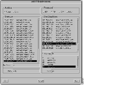 The Add IP Requirements window, shown in Figure 7-5, is displayed. New requirements to the tcp_telnet_test requirements set are created using this window. Allow (Permit button selected) a TCP/Telnet connection from port 200 of source end system netsys9b.fddi0.0.es (selected from the Sources list) to port 23 (automatically specified in the Destinations Port field when the telnet/tcp entry is selected from the list) of destination end system netsys9a.fddi3/0.0.es (selected from the Destinations list). The default transport control protocol is TCP.