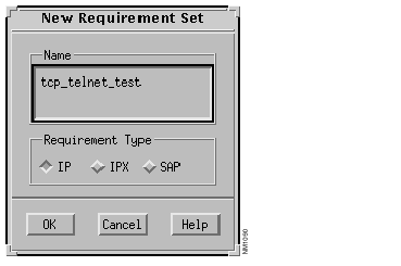 The New Requirement Set window, shown in Figure 7-4, is displayed. Create a new set of protocol dependent (in this case IP) connectivity requirements and save them to the file specified in this window.