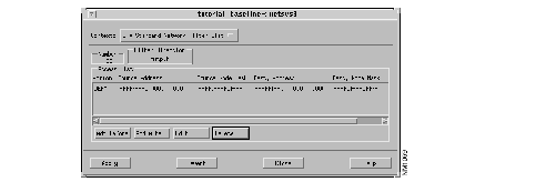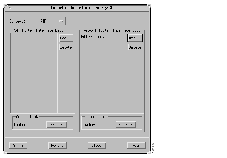 The IPX Network Filter List window is displayed. The network filter parameters are displayed in this window. You are able to add, edit, or delete entries from this network filter access list from this window. You can click on the Close button when you are done viewing the network filter parameters to dismiss the IPX Network Filter List window or you can use the Context menu to return to a previously displayed window.