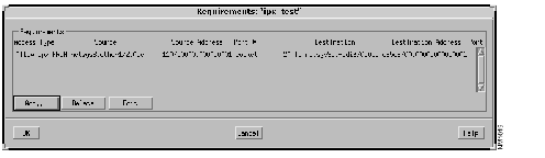 The Add IPX Requirements window, partially shown in Figure 10-5, is displayed. You create new requirements in the ipx_test requirements set using this window. Allow (Permit button selected) an IPX connection from socket 20 of source end system netsys8.ether1/2.0.es.ipx.1 (1107.0000.0000.0001) to socket 30 of destination end system netsys9a.fddi3/0.0.es.ipx.1 (c65c6700.0000.0000.0001).