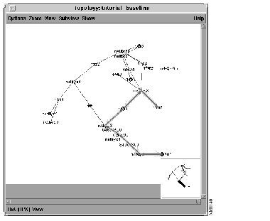Assess the status of the results in the tutorial_baseline+ Requirements Analysis window then check the Topology (Figure 10-18) and Round Trip Path windows to see the new, highlighted route taken. Notice the thicker path (source end system to destination end system) has changed its course (it bypasses the netsys3 router's fddi3/0 input interface.)