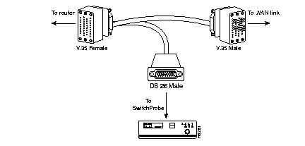 Connect to the WAN link through a T-cable, supplied with the SwitchProbe, which provides a passive tap to the WAN connection between the router and the WAN link terminating device (DSU/CSU). The router to DSU/CSU (DTE to DCE) connection is a straight passthrough cable.