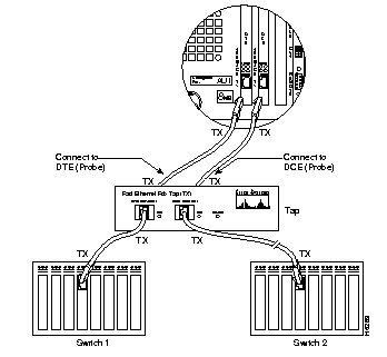 Step 3 Use a Category 5 crossover cable to connect the DTE Network port of the Fast Ethernet Tap to the DTE interface of the SwitchProbe.
