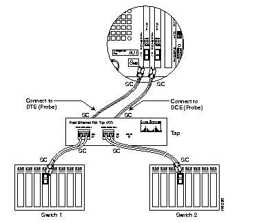 Step 1 Use the SC-to-ST cable included with the SwitchProbe device to connect Switch 1 to the DTE Network port on the Fast Ethernet FDX Tap. The ST connector is plugged into Switch 1, and the SC connector is plugged into the Tap.