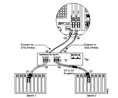 Step 2 Use the other SC-to-ST cable included with the SwitchProbe device to connect the ST to ST coupler to the DCE Network port on the Fast Ethernet FDX Tap. The SC connector is plugged into the Tap, and the ST connector is plugged into the coupler.